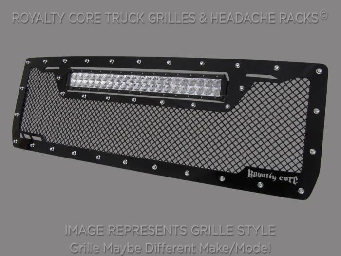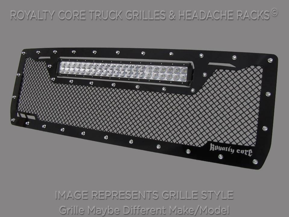 Royalty Core's proprietary corrosion resistant stainless technology creates the most durable grille on the planet. It's engineered to exploit the cleanest installation possible for your specific truck model. This Royalty Core grille is customized to best match your truck with military grade strength you can count on such as a 12 gauge stainless steel construction, optimal mounting brackets, CNC precision machined brackets, frame, and logos, hand fabricated, all gloss surfaces are buffed to a deep smooth mirrored finish, triple chrome plated T304 stainless studs around frame with star flange design, stainless super woven mesh, and absolutely no plastic. Royalty Core offers the industry's largest customized line of grilles and logos available.