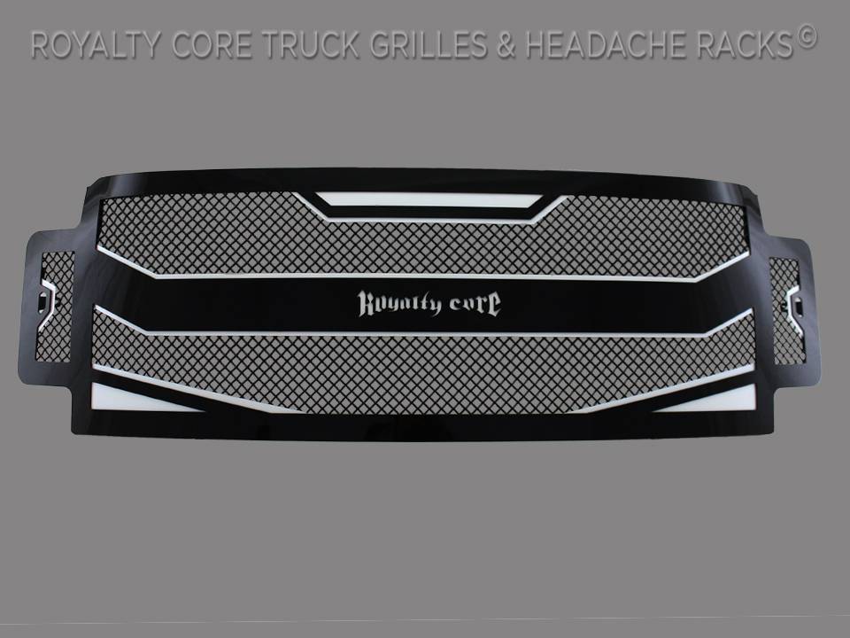 Royalty Core's proprietary corrosion resistant stainless technology creates the most durable grille on the planet. It's engineered to exploit the cleanest installation possible for your specific truck model. This Royalty Core grille is customized to best match your truck with military grade strength you can count on such as a 12 gauge stainless steel construction, optimal mounting brackets, CNC precision machined brackets, frame, and logos, hand fabricated, all gloss surfaces are buffed to a deep smooth mirrored finish, triple chrome plated T304 stainless studs around frame with star flange design, stainless super woven mesh, and absolutely no plastic. Royalty Core offers the industry's largest customized line of grilles and logos available.