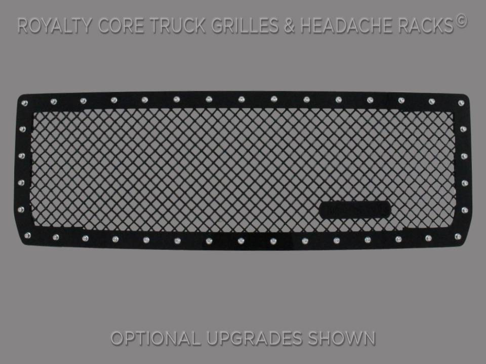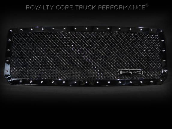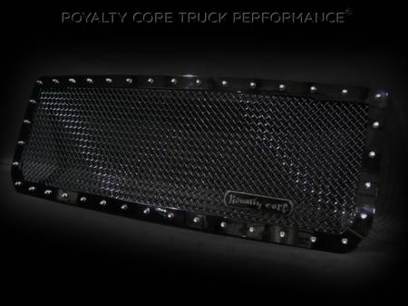 Royalty Core's proprietary corrosion resistant stainless technology creates the most durable grille on the planet. It's engineered to exploit the cleanest installation possible for your specific truck model. This Royalty Core grille is customized to best match your truck with military grade strength you can count on such as a 12 gauge stainless steel construction, optimal mounting brackets, CNC precision machined brackets, frame, and logos, hand fabricated, all gloss surfaces are buffed to a deep smooth mirrored finish, triple chrome plated T304 stainless studs around frame with star flange design, stainless super woven mesh, and absolutely no plastic. Royalty Core offers the industry's largest customized line of grilles and logos available.