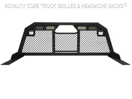 Royalty Core's RC88 Headache Racks replicate the image of their incredible custom grilles for the ultimate appearance. Royalty Core's T6 Billet Aluminum Mesh enables maximum rearview visibility and keeps your cab cooler from sun-rays. The same custom studs from their grilles hold a removable centerpiece for slider window access. The RC88 Headache Rack is essential for the final line of defense against cargo crashing through your truck's back window in the event of emergency braking, collision, or bumps._The RC88 is a quick and easy install and is removable in minutes with superior adjustable mounting engineered to withstand heavy duty off road use. The RC88 is ideal for carrying long cargo and a beefy support tube runs across the bottom to prevent ATV tires from bending the front of your truck box out of shape. Each RC88 headache rack is designed to fit your exact truck model and is not one rack fits all.You can order your RC88 with or without knobs, matching cab height or standard, and custom Royalty Core logos add the ultimate touch. The RC88 is built in house using One-of-a-Kind 4x 2 Octagon wide profile T6 Billet tubing laid out in a heavy duty double framed construction for literally the toughest headache rack on the market. The RC88 features T6 billet aluminum heavy gauge Super Mesh which is corrosion resistant and flexible to better prevent denting in the event of cargo contact. The RC88 has 24 inch base plates compatible with all bed toolboxes and custom brackets are available for warning lights, signs, beacons, flags, and lights as an upgradable option. Finishes available are scratch resistant satin black, gloss black, or raw to be finished locally. The RC88 Headache Rack is backed by a Lifetime Warranty!