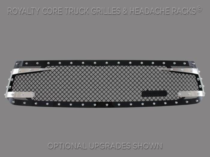 Royalty Core's proprietary corrosion resistant stainless technology creates the most durable grille on the planet. It's engineered to exploit the cleanest installation possible for your specific truck model. This Royalty Core grille is customized to best match your truck with military grade strength you can count on such as a 12 gauge stainless steel construction, optimal mounting brackets, CNC precision machined brackets, frame, and logos, hand fabricated, all gloss surfaces are buffed to a deep smooth mirrored finish, triple chrome plated T304 stainless studs around frame with star flange design, stainless super woven mesh, and absolutely no plastic. Royalty Core offers the industry's largest customized line of grilles and logos available.