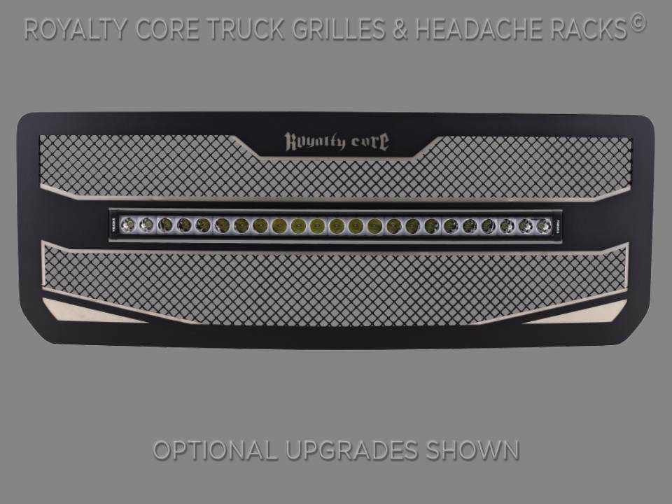 Royalty Core's proprietary corrosion resistant stainless technology creates the most durable grille on the planet. It's engineered to exploit the cleanest installation possible for your specific truck model. This Royalty Core grille is customized to best match your truck with military grade strength you can count on such as a 12 gauge stainless steel construction, optimal mounting brackets, CNC precision machined brackets, frame, and logos, hand fabricated, all gloss surfaces are buffed to a deep smooth mirrored finish, triple chrome plated T304 stainless studs around frame with star flange design, stainless super woven mesh, and absolutely no plastic. Royalty Core offers the industry's largest customized line of grilles and logos available.