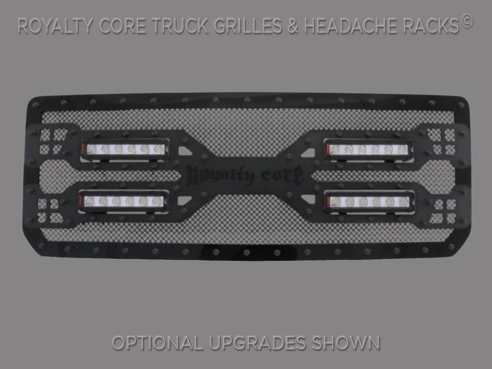 Royalty Core incorporates feature elements creating our advanced RC5 Quadrant grille with centrally positioned quad LED light bars housed within an impressive center bar with Your choice of color Royalty Core Logo underlay. Highly detailed machining along the entire frame perimeter of this astounding grille design highlights our unique blend of twin mesh accenting each edge. This grille includes four insanely powerful Vision X LED light bars.