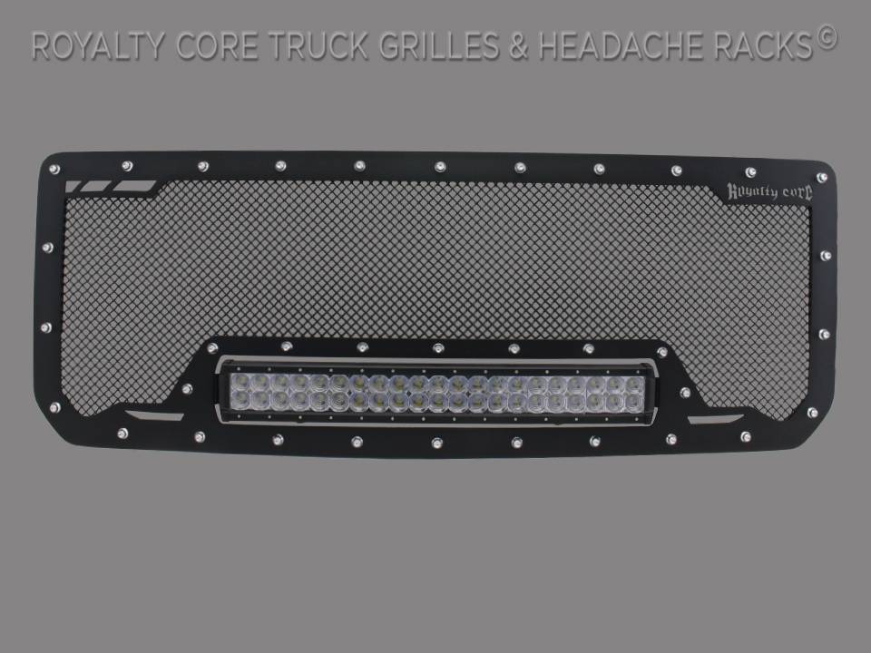 Royalty Core's proprietary corrosion resistant stainless technology creates the most durable grille on the planet. It's engineered to exploit the cleanest installation possible for your specific truck model. This Royalty Core grille is customized to best match your truck with military grade strength you can count on such as a 12 gauge stainless steel construction, optimal mounting brackets, CNC precision machined brackets, frame, and logos, hand fabricated, all gloss surfaces are buffed to a deep smooth mirrored finish, triple chrome plated T304 stainless studs around frame with star flange design, stainless super woven mesh, and absolutely no plastic. Royalty Core offers the industry's largest customized line of grilles and logos available.