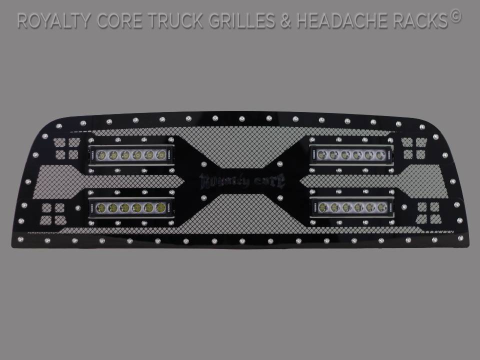Royalty Core incorporates feature elements creating our advanced RC5 Quadrant grille with centrally positioned quad LED light bars housed within an impressive center bar with Your choice of color Royalty Core Logo underlay. Highly detailed machining along the entire frame perimeter of this astounding grille design highlights our unique blend of twin mesh accenting each edge. This grille includes four insanely powerful Royalty Core 12"" LED light bars.