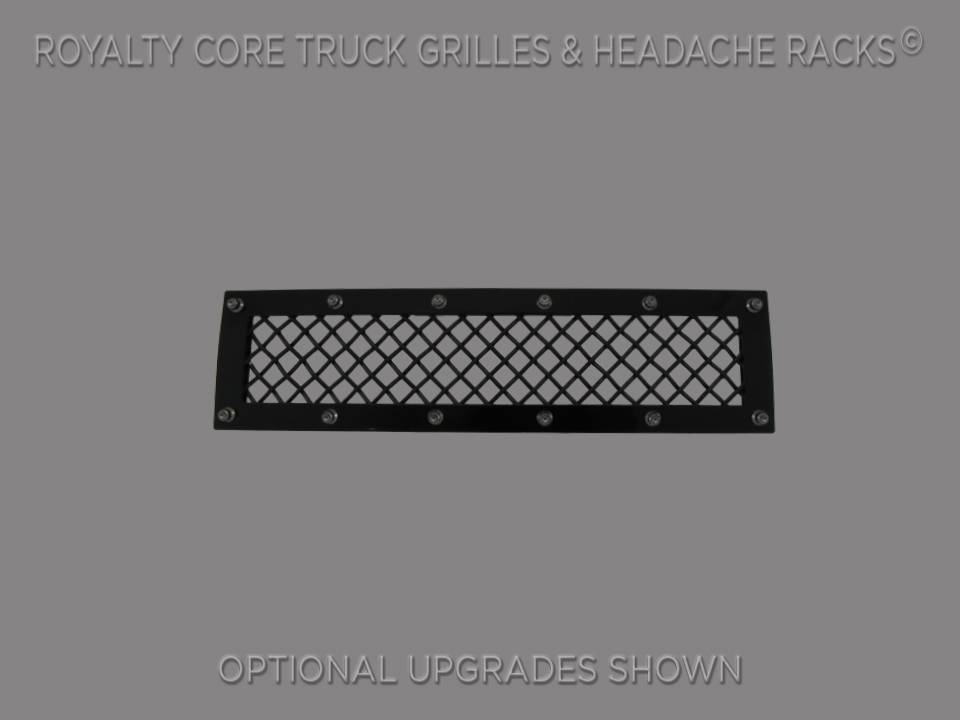Complete and reinforce your truck with Royalty Core's impressive bumper grille package. This uniquely designed bumper grille smooths your factory bumpers dead space while exposing the function of your tow hooks. The options on your bumper grille will come to match when ordered with your main upper grille.