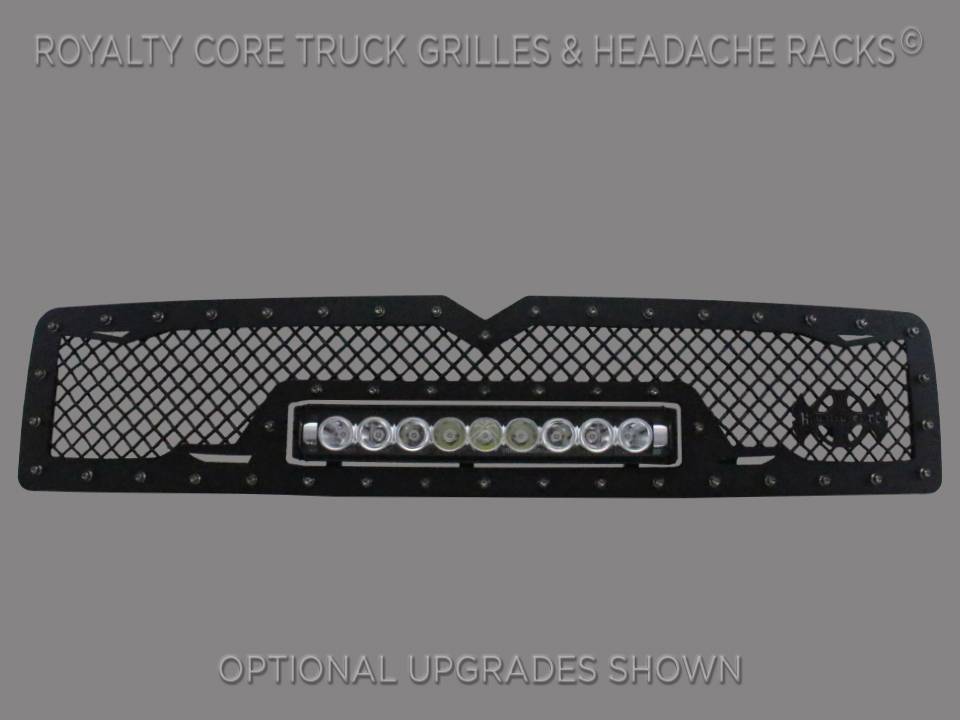 Royalty Core's proprietary corrosion resistant stainless technology creates the most durable grille on the planet. It's engineered to exploit the cleanest installation possible for your specific truck model. This Royalty Core grille is customized to best match your truck with military grade strength you can count on such as a 12 gauge stainless steel construction, optimal mounting brackets, CNC precision machined brackets, frame, and logos, hand fabricated, all gloss surfaces are buffed to a deep smooth mirrored finish, triple chrome plated T304 stainless studs around frame with star flange design, stainless super woven mesh, and absolutely no plastic. Royalty Core offers the industry's largest customized line of grilles and logos available.