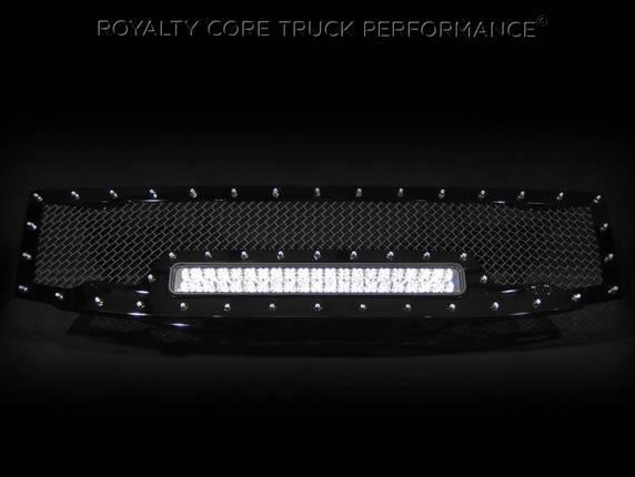 Royalty Core's proprietary corrosion resistant stainless technology creates the most durable grille on the planet. It's engineered to exploit the cleanest installation possible for your specific truck model. This Royalty Core grille is customized to best match your truck with military grade strength you can count on such as a 12 gauge stainless steel construction, optimal mounting brackets, CNC precision machined brackets, frame, and logos, hand fabricated, all gloss surfaces are buffed to a deep smooth mirrored finish, triple chrome plated T304 stainless studs around frame with star flange design, stainless super woven mesh, and absolutely no plastic. Royalty Core offers the industry's largest customized line of grilles and logos available.
