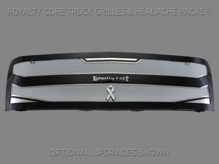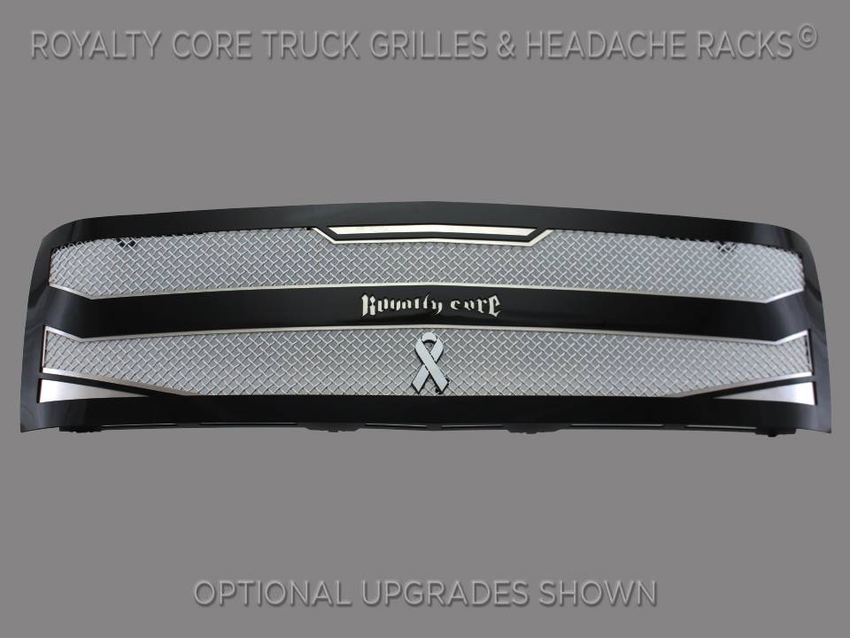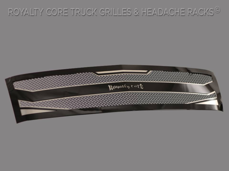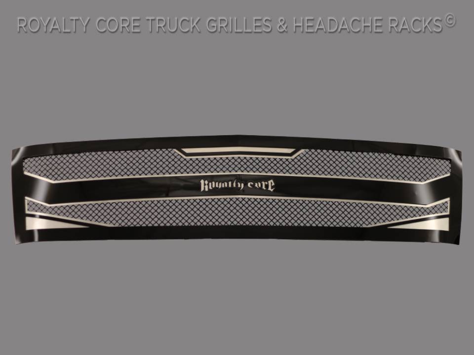 Royalty Core's proprietary corrosion resistant stainless technology creates the most durable grille on the planet. It's engineered to exploit the cleanest installation possible for your specific truck model. This Royalty Core grille is customized to best match your truck with military grade strength you can count on such as a 12 gauge stainless steel construction, optimal mounting brackets, CNC precision machined brackets, frame, and logos, hand fabricated, all gloss surfaces are buffed to a deep smooth mirrored finish, triple chrome plated T304 stainless studs around frame with star flange design, stainless super woven mesh, and absolutely no plastic. Royalty Core offers the industry's largest customized line of grilles and logos available.