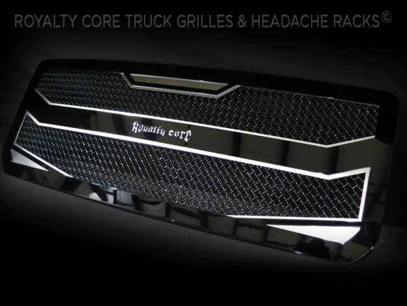 Royalty Core's proprietary corrosion resistant stainless technology creates the most durable grille on the planet. It's engineered to exploit the cleanest installation possible for your specific truck model. This Royalty Core grille is customized to best match your truck with military grade strength you can count on such as a 12 gauge stainless steel construction, optimal mounting brackets, CNC precision machined brackets, frame, and logos, hand fabricated, all gloss surfaces are buffed to a deep smooth mirrored finish, triple chrome plated T304 stainless studs around frame with star flange design, stainless super woven mesh, and absolutely no plastic. Royalty Core offers the industry's largest customized line of grilles and logos available.