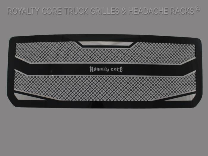 Royalty Core's proprietary corrosion resistant stainless technology creates the most durable grille on the planet. It's engineered to exploit the cleanest installation possible for your specific truck model. This Royalty Core grille is customized to best match your truck with military grade strength you can count on such as a 12 gauge stainless steel construction, optimal mounting brackets, CNC precision machined brackets, frame, and logos, hand fabricated, all gloss surfaces are buffed to a deep smooth mirrored finish, triple chrome plated T304 stainless studs around frame with star flange design, stainless super woven mesh, and absolutely no plastic. Royalty Core offers the industry's largest customized line of grilles and logos available.