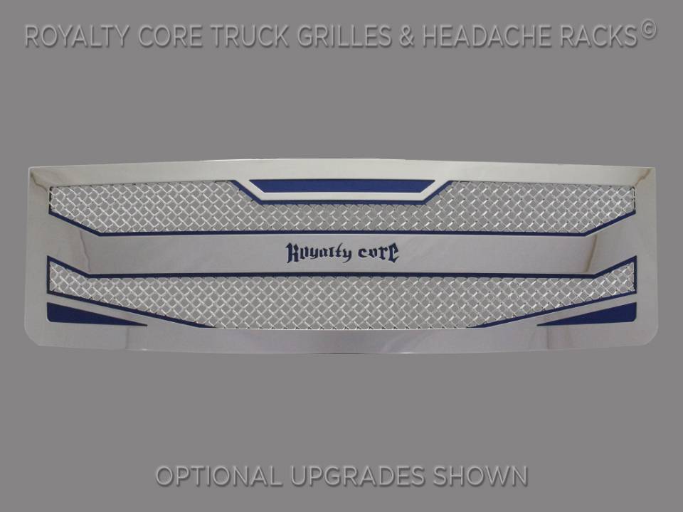 Royalty Core's proprietary corrosion resistant stainless technology creates the most durable grille on the planet. It's engineered to exploit the cleanest installation possible for your specific truck model. This Royalty Core grille is customized to best match your truck with military grade strength you can count on such as a 12 gauge stainless steel construction, optimal mounting brackets, CNC precision machined brackets, frame, and logos, hand fabricated, all gloss surfaces are buffed to a deep smooth mirrored finish, triple chrome plated T304 stainless studs around frame with star flange design, stainless super woven mesh, and absolutely no plastic. Royalty Core offers the industry's largest customized line of grilles and logos available.
